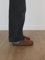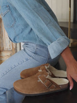 Camel-colored leather clog with anatomical sole Genuins and adjustable buckle. Interior and sole lined with warm and soft beige wool.